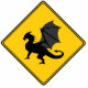 Pas op! Gevaarlijke omstandigheden voor de toekomst. Fantasy komt overeen met de werkelijkheid. Drakenkruising. Grappig teken gemaakt in de stijl van een verkeersbord.