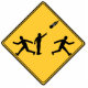 "Hey, kijk eens!" Grappig bord gemaakt in de stijl van een verkeersbord. Tekening waarop een meteoor of een meteoriet te zien is die de grond snel zal raken. Een apocalyps voorspelling uit 2012.