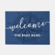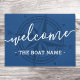 Donkerblauw of aangepast kleurwelkom aan boord van een deur met de tekst "Welkom" en de naam van uw aangepaste boot op een blauwe achtergrond met een compass-roos in een donkerdere schaduw van blauw