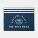 bootmat met blauwe strepen en persoonlijke naamdetails en nautische elementen De kleur en tekst kunnen worden bewerkt.