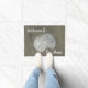 Deze huisgast heeft een foto van een natuur die een zanddollar in nat zand vastlegt. De witte zanddollar wordt omringd door bruin en grijs zand. "Welkom bij ons thuis" wordt in lichtgrijs weergegeven en kan zo nodig snel worden aangepast.