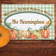 Welkom bij onze pompoentetekst met uw familienaam die voor een waterverf pompoenpleister op een groene achtergrond van gingham is gegrild.