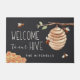 Welkom gasten met deze schattige bijen, de doormat, met waterverf illustraties van honingbijen, honingraat en een bijenkorf, met "welkom in onze bijenkorf" in ivoren letters. Pas je aan met je familienaam onderaan.