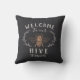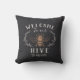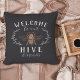 Welkom gasten met deze schattige bijen die een kussen met een stijl bijenafbeelding met botanische bladdetails bevatten. "Welkom bij onze korf" staat in ivoren letters. Pas je aan met je familienaam onderaan.