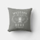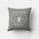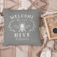 Welkom gasten met deze schattige bijenthema gooien kussen met een afbeelding van honingbijen, voorzien van een botanisch blad met details op een zachte grijze achtergrond. "Welkom bij onze korf" staat in witte letters. Pas je aan met je familienaam onderaan.