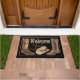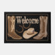 Decoreer met westerne rodeostijl met deze deurmat met de woorden Welkom. Het ontwerp is voorzien van bruine en geelbruine cowboylaarzen en een western pet met hoefijzers op een zwarte achtergrond. Dit ontwerp is originele kunst door Phyllis Dobbs en is beschikbaar met andere kleurenachtergronden en bij het coördineren van producten.