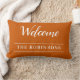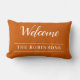 Elegante aangepaste kussen functies "Welkom" in witte script typografie op verbrande oranje achtergrond met de achternaam van uw familie om een warm welkom aan uw gasten te bieden. Ik wens u een gezellige en warme herfst met alle vreugde die het seizoen brengt. Geniet ervan!
