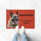 Deze deurmat heeft een foto van een Duitse Herdershond op een roestige oranje-rode achtergrond, met de woorden: WELKOM en je familienaam. Alle woorden kunnen gepersonaliseerd worden.