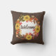 Dit collage-ontworpen werpen kussen kenmerkt een het seizoensontwerp van de herfst op een donkerbruine achtergrond. De kreet werd gemaakt door met de hand een verscheidenheid aan herfst-seizoensbloemen en -bladeren in lagen te plaatsen. Het centrum van de kussen is waar u met uw eigen tekst zult personaliseren of zoals getoond "Welkome" koopt. Gebruik deze kussen op je voorste veranda om gasten bij je thuis of op je geduld te verwelkomen. Als u liever binnenshuis gebruikt, kiest u een andere stof.