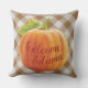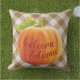 Kute outdoorkussen met een oranje herfstpompoen op een witte en donkere taupe bruine gele achtergrond van gingham, en vriendelijke 'Welcome Autumn' tekstquote. Whimsical Thanksgiving vakantie decor accent voor het versieren van de voor- of achterporch, patio of veranda van uw boerderij huisstijl versierd landhuisje, logcabine, rustic Lake home of cozy river retratreat.