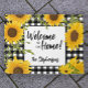 Deze leuke en kleurrijke bloemenwelkomstmat heeft geel en oranje zonnebloemen met een Welcome To Our Home-bericht en een aanpasbare naam. De zwart-witte buffelplaid achtergrond geeft een schattig boerderijgevoel. Verwelkom bezoekers met een buitenmat die uw tuininrichting zal verbeteren.