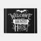 Deze eenvoudige welkome vormgeving met een zwarte achtergrond en een wit gehakt huisontwerp is een unieke aanvulling op uw Halloween décor.