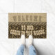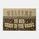 Mooie hedendaagse faux burlap, met een wiekenweef, ziet er een patroon en een touw uit. Met "Welkom op onze cabine in de Bossen" citeert u het ontwerp. Decoratief, schattig en modern thuisdeuropbrengst voor het versieren van de ingang van je huis, de veranda van je strandhuis, het landhuis, de logcabine, het meer of het riviervakantiehuis.