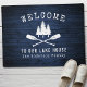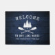 Een mooi, bijtend doormat met "Welkom in ons meer huis" en uw persoonlijke familienaam. Dit unieke ontwerp is voorzien van een wit silhouet van gekruiste bootzeuren en dennenbomen op een drukplaat van houtplanken in rijke blauwe kleuren. Om meer design als deze te zien, kunt u mijn winkel hier op Zazzle.com/Rustic_Charm bezoeken. Bedankt.