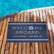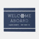 Welkom gasten aan boord van je boot met dit coole aangepast hormoon met "welkom aan boord" in witte letters met een scheepswiel in plaats van de "O". Pas de naam van uw boot en de scheepsregistratie aan op een klassieke blauwe achtergrond van de marine met witte touwrand.