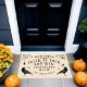 Fun spooky Halloween gedistilleerde board-geïnspireerde deurmat. De Halloween-deurmat is voorzien van een leuk en creatief ontwerp dat lijkt op een spirituele plank. De letters van de gedistilleerde plank verklaren "het Onthaal gaat bij Uw Eigen Risico binnen". Ja en Neen, en getallen zijn in het ontwerp opgenomen om op een gedistilleerde board te lijken. Spinnenwebben en zwarte kraaien voegen een stijlvol en vlekkerig Halloween-ontwerp toe. Alle illustraties in deze stijlvolle en spooky Halloween spirituele serijlade zijn handgetekende originele kunstwerken van de Moodthologie.