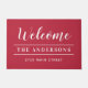 Elegant en tijdloze aangepaste slaapstand biedt "Welkom" in het schrijven van een kalligrafiescript met de achternaam van uw familie en het straatadres van uw huis dat in wit is gepersonaliseerd met eenvoudige strepe accenten. Nota, kunnen de rode achtergrond en de witte tekstkleuren worden gewijzigd om met uw veranda of ingangsdecor te coördineren.