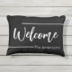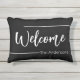 Welkom is in een groot, wit script in het midden van het kussen. Dit zwarte kussen heeft ook een andere regel weergavetekst aan de onderkant. U kunt een of beide regels weergavetekst bewerken om een aangepast bericht te creëer, zoals de achternaam van de huiseigenaar.