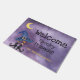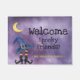 Deze leuke Halloween deurmat heeft waterverf graphics van heksenbenen en pet. De tekst luidt: Welkom Spooky Friends! Personaliseer de deurmat met jouw naam.