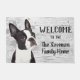 Welkom bij het startpunt "Uw familienaam" of verander in het huisje. Een hond met de naam "Welkom mat" voor de familie die van hun hond houdt als deel van hun familie. Het ontwerp bevat een schattige Boston Terrier. Pas je familienaam aan.