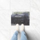 Een deurmat met een foto van een treinmotor.
