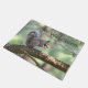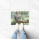 Deze doormat heeft een eekhoorn die zijn lunch hoog opeet in een dennenboom in Connecticut.