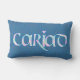 Een leuke lumbale kussen met het Welsh woord 'cariad' in een Keltisch script, gevuld met een floreel patroon geschetst in helder blauw op een diepe blauwe achtergrond. Perfect geschenk voor degene van wie je houdt!
