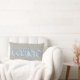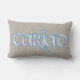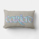 Een leuke lumbale kussen met het Welsh woord 'cariad' in een Keltisch script, gevuld met een floreel patroon geschetst in helder blauw op een hessian-kleurige (burlap) achtergrond.