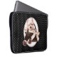 Schattige estie puppy in retro zwarte en witte handtas, geschilderd door kunstenaar Maryline Cazenave.