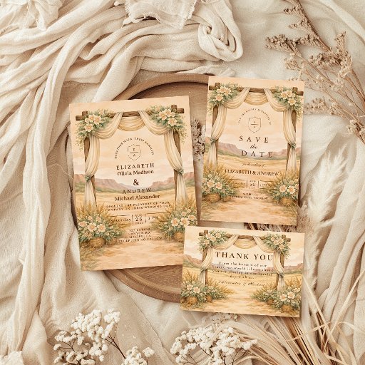 A rustic western wedding design inspired by desert landscapes, warm earth tones, and vintage botanical details. Featuring a sun-washed desert scene, wooden fencing accents, and soft florals, this invitation is perfect for ranch weddings, western celebrations, or couples planning a desert-inspired ceremony. Elegant, timeless, and fully customizable for your special day.