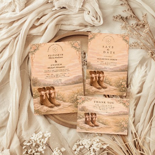 A rustic western wedding design inspired by desert landscapes, warm earth tones, and vintage botanical details. Featuring a sun-washed desert scene, wooden fencing accents, and soft florals, this invitation is perfect for ranch weddings, western celebrations, or couples planning a desert-inspired ceremony. Elegant, timeless, and fully customizable for your special day.