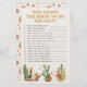 Western Vrijgezellenfeest spel. Stel uw gasten op de proef met deze charmante vrijgezellenfeesten spelkaart, prachtig geïllustreerd met Wild West-flair - denk aan waterverf cactussen, laarzen en Westerne iconen in een palet van warme neutralen, roze, sinaasappels en luxe goud en zwart. Het coördinatiepatroon op de rug maakt de look compleet. Het is een leuke manier om de bruid te vieren en de energie hoog te houden. Zie wie haar echt het beste kent - voeg dit spel toe aan je line-up!
