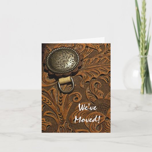 kondig aan dat u met de charmante Westerne Verandering van de Zadelwagen van het Paard van het Adres van de Kaart bent bewogen. Perfect als je naar een boerderij bent verhuisd of een paard en paardenliefhebber bent. Pas het aan met jouw naam, adres, telefoonnummer en e-mailadres. Deze stijlvolle toepassing die we hebben verplaatst, biedt een digitaal verbeterde, close-up foto van een bruin, western paardenzadels met een ingewikkeld bladerontwerp.