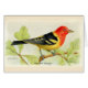 tekening van een Westerne Tanager met een rode kop en gele borst op een grijze achtergrond. Deze gekleurde tekening van de Westerne Tanager komt uit de ouderwetse Arm en Hammer Baking Soda adverteren kaartreeks.