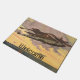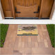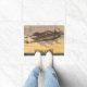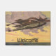 Eenvoudig te personaliseren deze welkomstmat met uw aangepaste tekst! illustratie Science Fiction Reis- en transportontwerp met een groot vliegtuig dat over de oceaan vliegt met andere vliegtuigen in de lucht. Dit watervliegtuig ziet eruit als een groot futuristisch cruiseschip of boot met vleugels. Een klassieke 50s retro stripboek Sci Fi design of the future.
