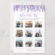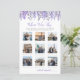 The design features soft watercolor lavender and lilac flowers arranged along the top, creating a gentle, romantic accent without overwhelming the layout. A mix of purple and gray fonts keeps the look refined and balanced, while the rest of the design stays clean and uncluttered so the focus remains on the photos and gameplay.