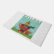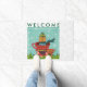 Een welkome deurmat met een afbeelding van een schattige oranje poes die in een theekopje zit. Het dragen van een winterse pet en sjaal. Sneeuwvlokken vallen binnen een lichtgroen vierkant. Witte sneeuwvlok achtergrond.