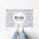 Welkom doormat met een patroon met een leuk summiere blik. Roze flamingos en ananas, ingesteld op een lichtblauw gestreept patroon met bladeren en harten overal rond.