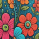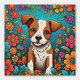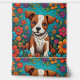 Schattigee bruine en witte puppyhond omgeven door oranje en roze bloemetjes met een blauwe achtergrond.