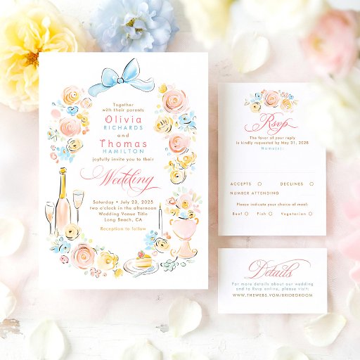 This whimsical yet elegant wedding invitation captures the emotion of the day with a playful, artful twist. Hand-drawn watercolor florals swirl into a loose, expressive wreath, paired with charming table-side illustrations — champagne, candles, cake, and glassware — bringing a cozy, celebratory tablescape aesthetic to life.