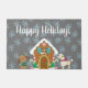 Een vun en feestelijk kerstsmasker is voorzien van een hondenmaaltijd, twee honden en lichtblauwe sneeuwvlokken op een donkergrijze achtergrond. Prettige feestdagen groet in wit modern manuscript.