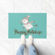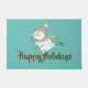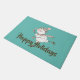 Whimsical-vakantiedoormat is uitgerust met sneeuwpoppen met bruin en roze sjaal en beanie op aqua-achtergrond en aanpasbare tekst.