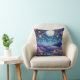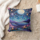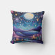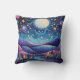 Een kussen met een mooie illustratie. Grappige en fantasierijke sfeer. Een grote gloeiende maan met overal sterren. Hangend over een prachtig landschap van bomen, bergen en een kronkelende rivier. Geweldige magische mystieke vibe.