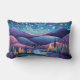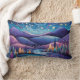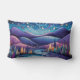 Een kussen met een mooie illustratie. Grappige en fantasierijke sfeer. Een prachtig landschap van bomen, bergen en een kronkelende rivier. Mystieke vibe.
