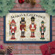 Gepersonaliseerde notenkraker deurmat - Seizoenen Groeten Welkom gasten in feestelijke stijl met deze gepersonaliseerde notenkraker deurmat. Vier charmante Notenkrakersoldaten staan trots in het midden van dit ontwerp, tegen een diep beige achtergrond met hulstbladeren en bessen. De bovenkant van de mat bevat de woorden "Season's Greetings", terwijl de onderkant een ruimte biedt voor personalisatie, waardoor het een unieke toevoeging is aan uw vakantiedecor. Perfect voor ingangen, deze deurmat voegt een vleugje traditionele kerstmagie en warmte toe aan uw huis.
