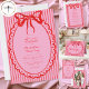 This whimsical invitation features a juicy red watercolor bow and a simple oval dotted frame against a playful red and pink striped background. Perfect for a wedding with a preppy, casual, or Valentine aesthetic, this charming design provides a sweet, hand-painted look for your special celebration. Created by Simply Farmhouse Press.