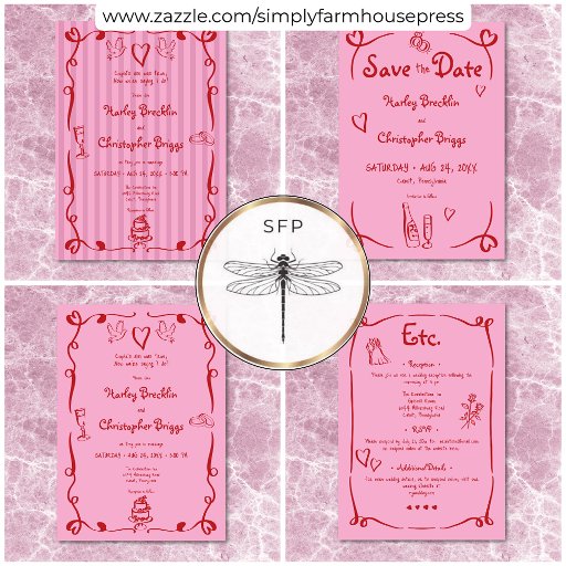 Zeg "Ik doe" met een vleugje charme! Onze grillige, handgetekende doodle-stijl, gestreepte bruiloft save the date kaart zet de perfecte toon voor uw grote dag. Met een zachte roze achtergrond en speelse rode schetsen van essentiële bruiloften - taarten, ringen, duiven en harten - barst dit ontwerp van liefde en persoonlijkheid. Het leuke, handgeschreven lettertype voegt een casual, oprecht gevoel toe, waardoor het net zo uniek is als je liefdesverhaal. Laat de vieringen beginnen met een ontwerp dat net zo vreugdevol en romantisch is als jij. Creëer door Simply Farmhouse Press.