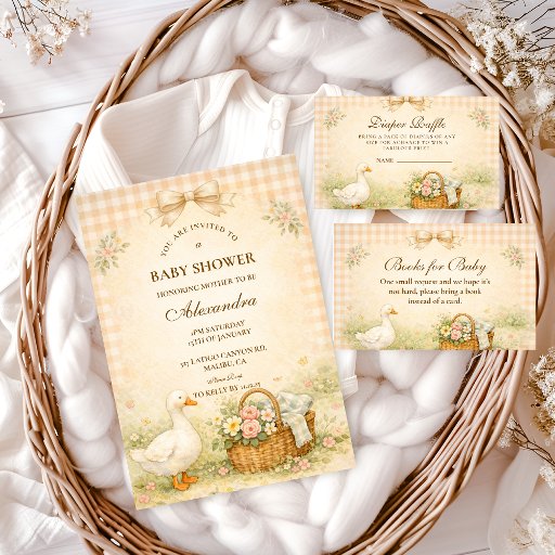 A charming storybook-style baby shower design featuring a sweet watercolor goose standing beside a nest filled with pastel eggs. Delicate spring flowers and soft greenery create a gentle countryside scene, while a blush bow and sage gingham background add a cozy cottagecore touch. The vintage illustration style and soft pastel palette give this design a whimsical nursery feel, perfect for a playful and heartwarming baby celebration.