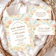 A whimsical watercolor design featuring a playful mix of pastel summer animals surrounded by tropical leaves, seashells, starfish, and soft botanical details. The cheerful palette of peach, mint, coral, and soft blue creates a light storybook atmosphere, while the elegant arch layout keeps the celebration details beautifully framed and easy to read. Perfect for a warm, joyful summer celebration with a charming nursery aesthetic.