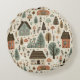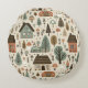 Cottage core throw pillows style village of cottages and trees, mushrooms, flowers in green, brown, and earthy tones.